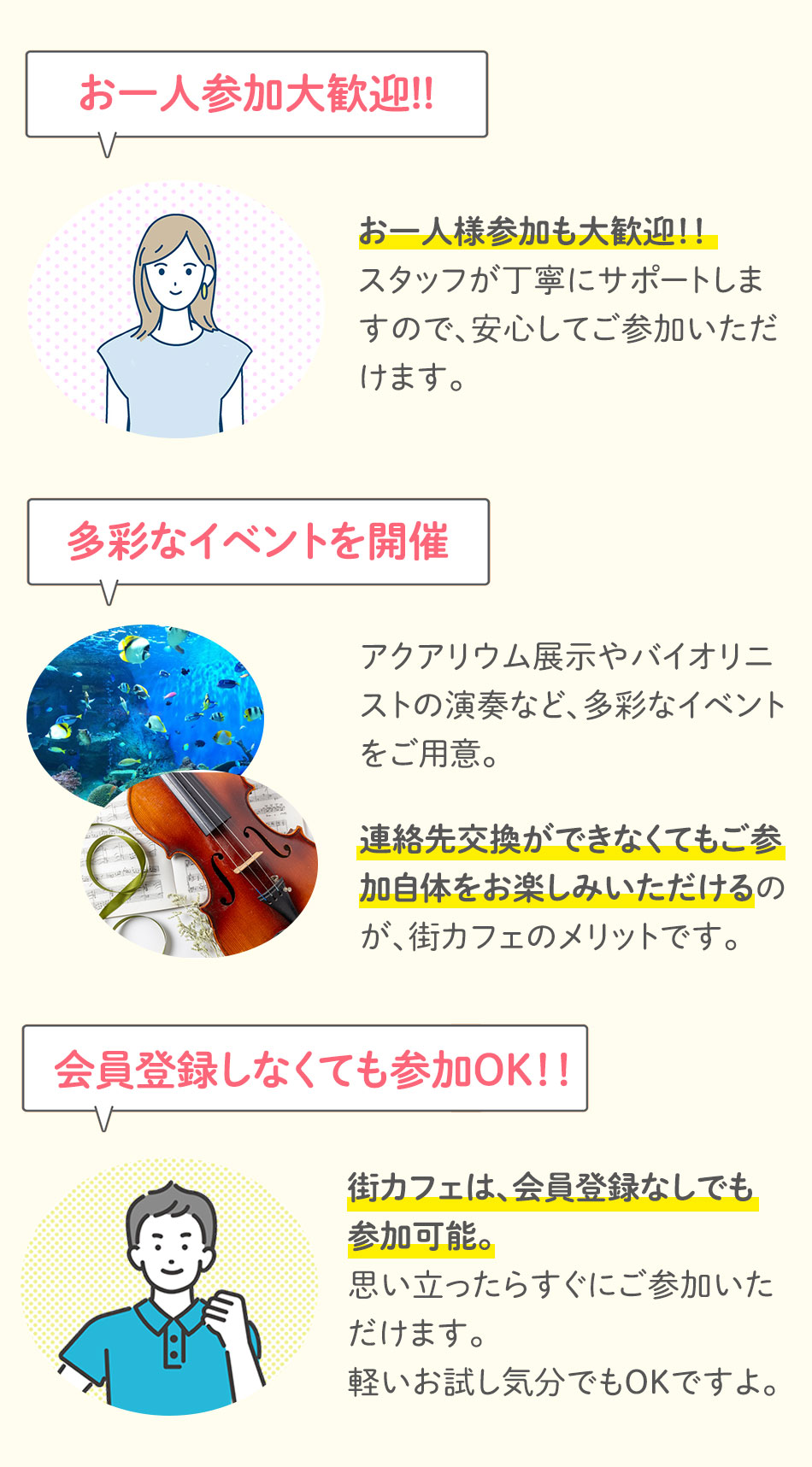 街カフェでは、参加者全員の本人確認を徹底。なりすましや虚偽の情報を防ぎ、安全な環境を確保しています。 イベントにはスタッフ・企画者が必ず同行します。本人同士に任せるだけでなくスタッフが間に入るから、安心・安全に出会えます。 イベントには会員登録なしでも参加できますが、会員登録をしておくと次回の参加がスムーズに。会員登録は無料です。 「イベントをチェックしてみる」ボタンまたはこちらをタップすると、イベント一覧のページに移動します。その中から参加したいイベントを選び、「予約する」のボタンをタップします。 あとは予約フォームに必要事項を記入し、送信するだけで完了です!!